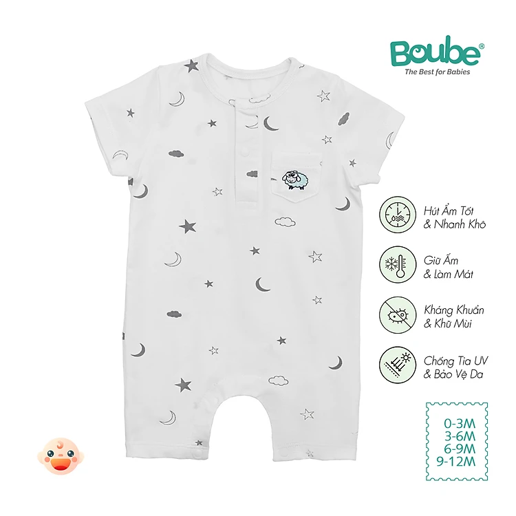 Bộ liền thân, bodysuit cộc tay cổ trụ họa tiết dễ thương cho bé sơ sinh Boube, vải Cotton organic thoáng mát- Size 0-12M