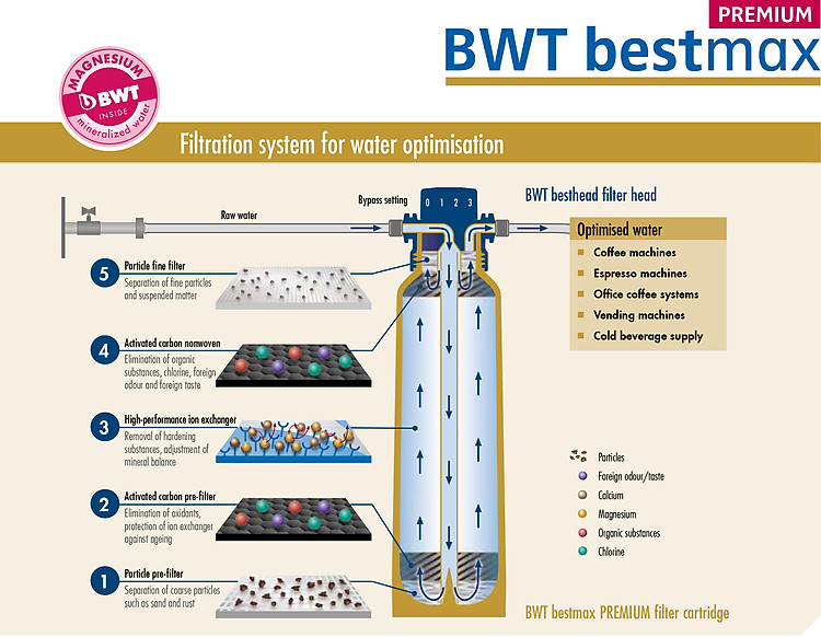 Lọc nước BWT bestmax PREMIUM với công thức AromaPLUS, là một hệ thống lọc thông minh giúp tối ưu hóa nước trong lĩnh vực dịch vụ thực phẩm. Một sự đổi mới đột phá, BWT bestmax PREMIUM bổ sung khoáng chất vào nước bằng cách sử dụng chất mang hương vị Mg2 + để đạt được hương vị đầy đủ của cà phê, trà hoặc ca cao. Có thể tự mình thưởng thức nước giàu Mg2 + vì nó không có hạt và không mùi, và hàm lượng khoáng chất cân bằng của nó làm cho nó trở thành một thức uống có hương vị dễ chịu. Bộ lọc BWT tốt nhất PREMIUM cân bằng các khoáng chất trong nước, đệm giá trị pH và tạo ra lớp crema espresso hoàn hảo.