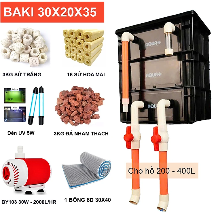 Bộ Lọc Nước Hồ Cá Koi 200-400L: Thùng Baki 3 Tầng, Bơm Baoyu 30W, Đèn UV 5W, Vật Liệu Lọc Đầy Đủ (B)