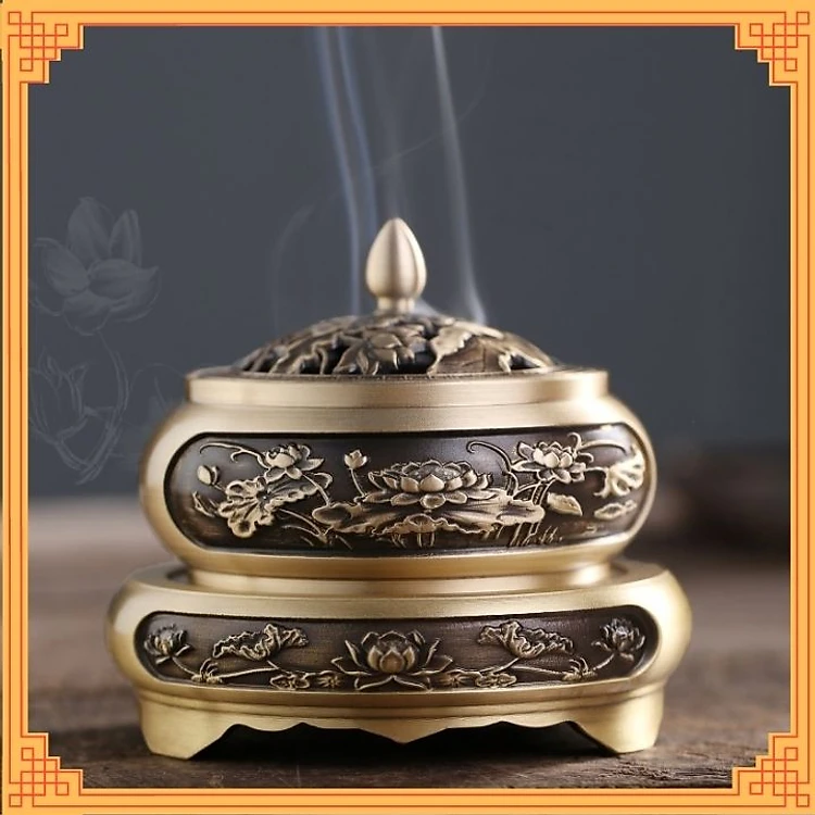 Bộ lư đồng xông trầm khắc hình hoa sen