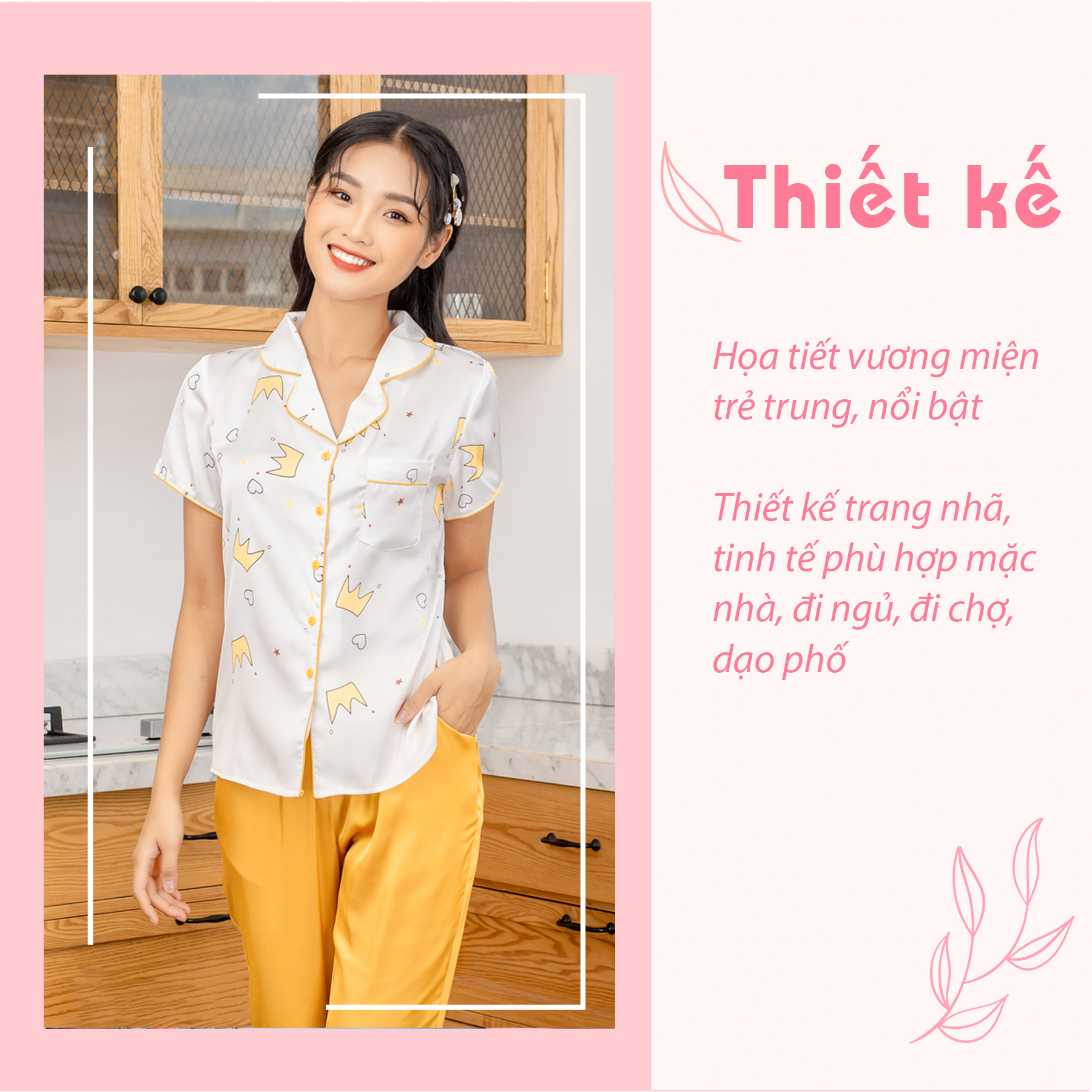Bộ lụa mặc nhà nữ mùa thu đông tay cộc quần dài họa tiết vương miện H232