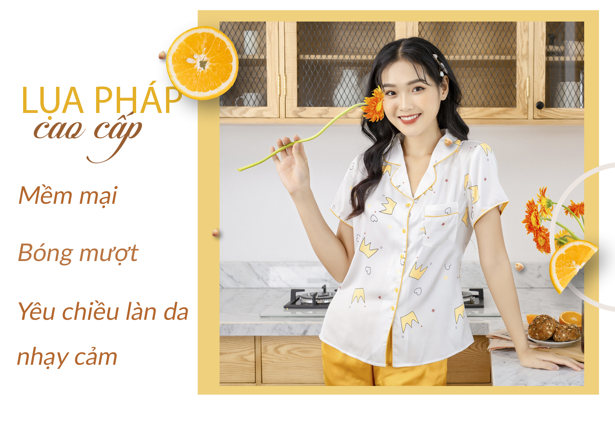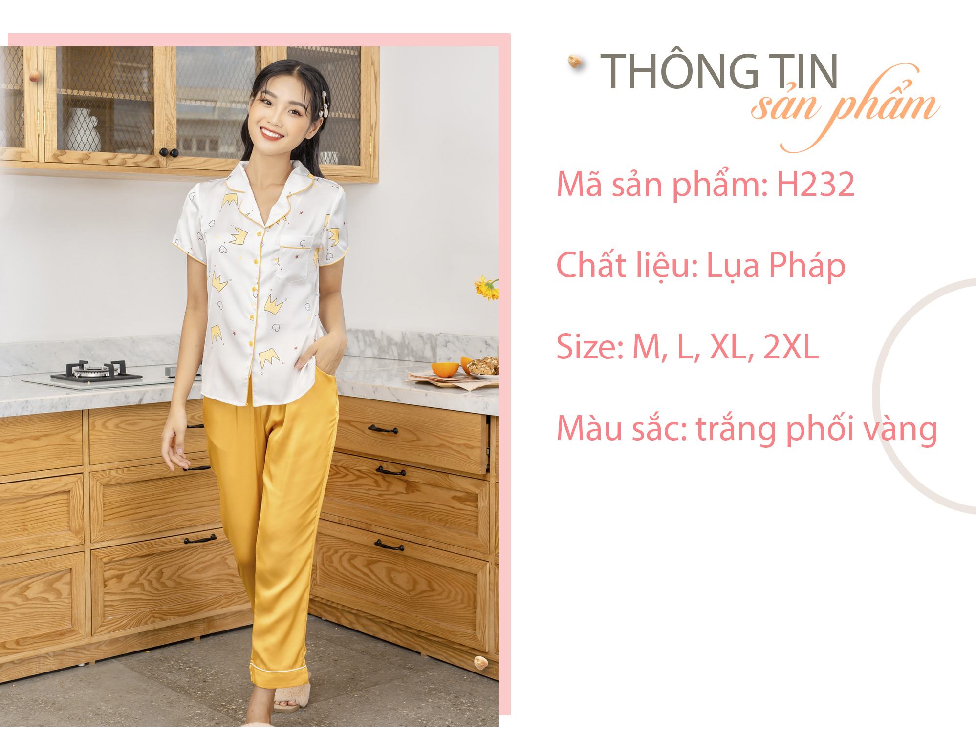 Đồ bộ tay ngắn quần dài họa tiết vương miện màu trắng phối vàng