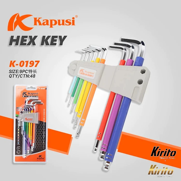 Bộ lục giác bi 7 màu KAPUSI Japan, 9 cây chữ L từ 1.5-10mm Thép cao cấp không gỉ.