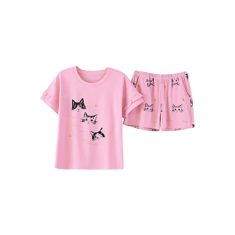 - Bộ Mặc Nhà Nữ Hình Mèo Xinh Xắn YG1080 - Hồng được thiết kế trẻ trung với áo thun và quần short phối họa tiết xinh xắn.