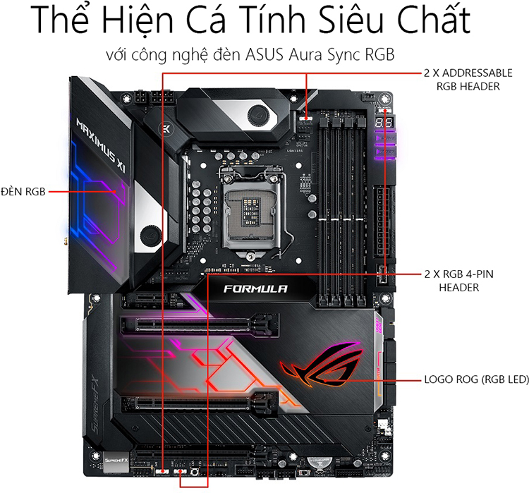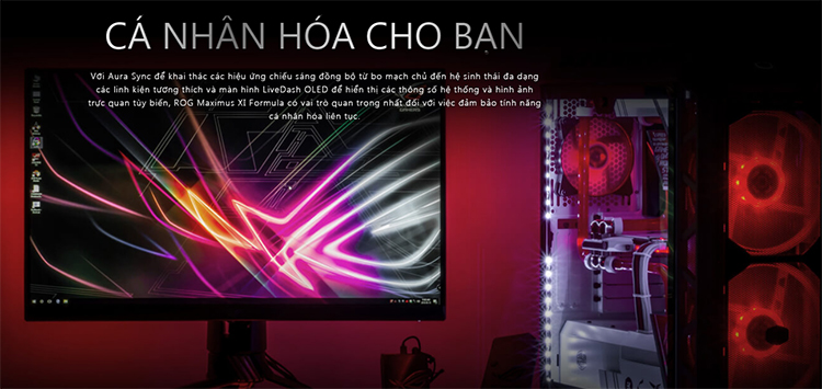 Với Aura Sync để khai thác các hiệu ứng chiếu sáng đồng bộ từ bo mạch chủ đến hệ sinh thái đa dạng các linh kiện tương thích và màn hình LiveDash OLED để hiển thị các thông số hệ thống và hình ảnh trực quan tùy biến, ROG Maximus XI Formula có vai trò quan trọng nhất đối với việc đảm bảo tính năng cá nhân hóa liên tục.
