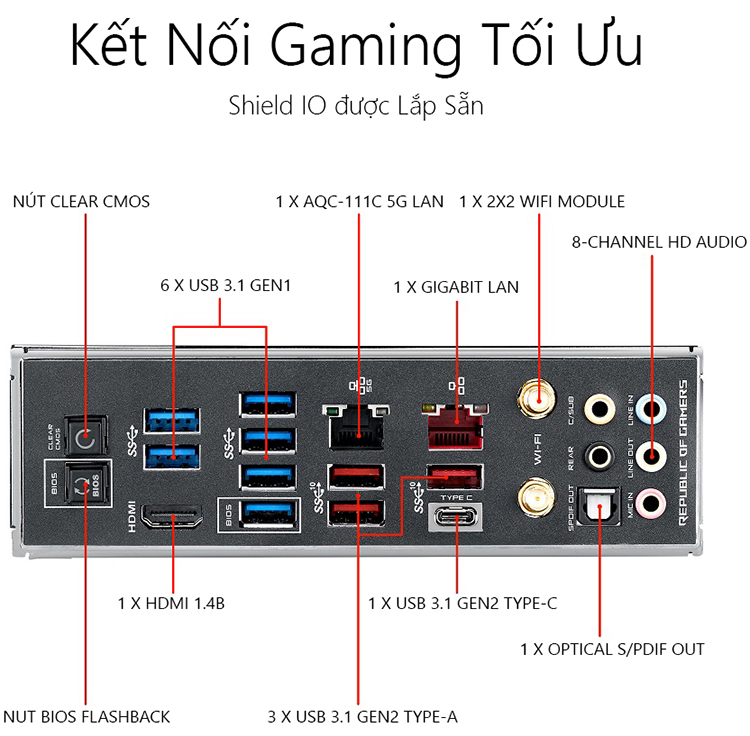 - 4 x Cổng USB 3.1 Gen 2 (4 ở mặt sau, màu xanh)