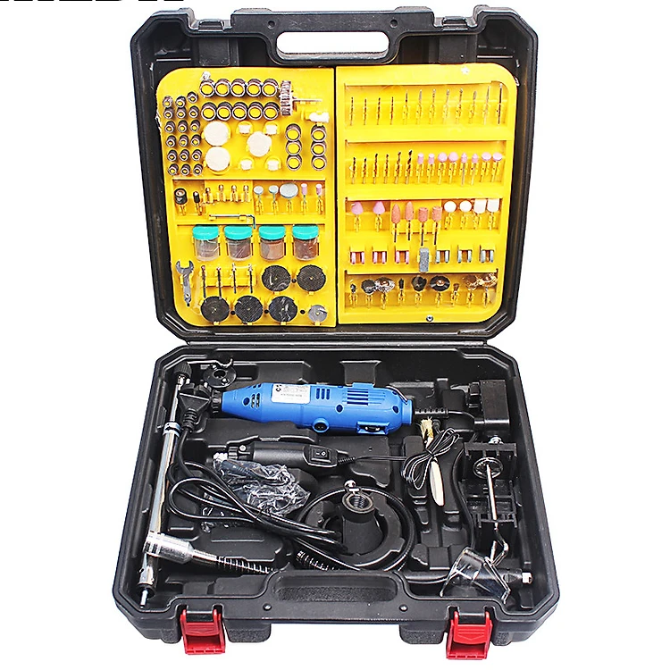 - Đóng gói đẹp, tiện dụng, phụ kiện đầy đủ, tổng cộng khoảng hơn 200 phụ kiện lớn và nhỏ: đầu mài (hình đĩa, hình trụ, hình nón), mũi khoan (1.5-2.3-3mm mỗi loại 2 chiếc), đầu khắc hợp kim (9 đầu các cỡ), lưỡi cắt, giấy nhám, đầu đánh bóng (đánh bóng kim loại, nhựa), bàn chải (sợi nhựa, kim loại..dùng để làm sạch vết bẩn, đánh rỉ sét), đá mài, xi đánh bóng, khoét lỗ…