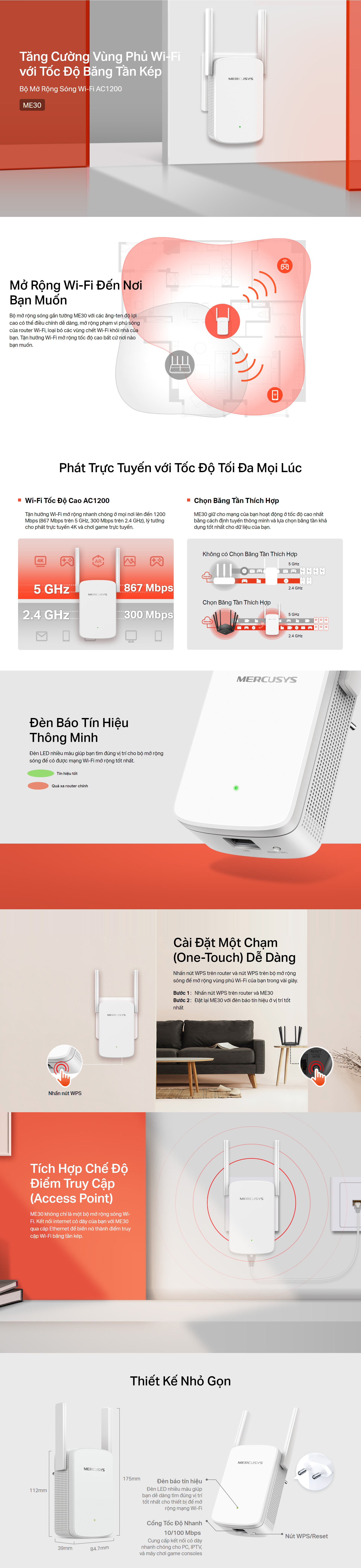 Bộ Mở Rộng Sóng Wifi MERCUSYS ME30 Chuẩn AC 1200Mpbs