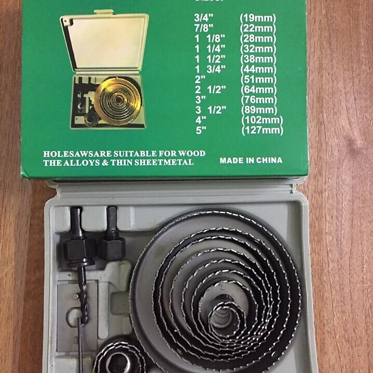 Bộ gồm 12 mũi khoét, 2 mũi khoan định tâm, 2 phụ kiện vặn mở