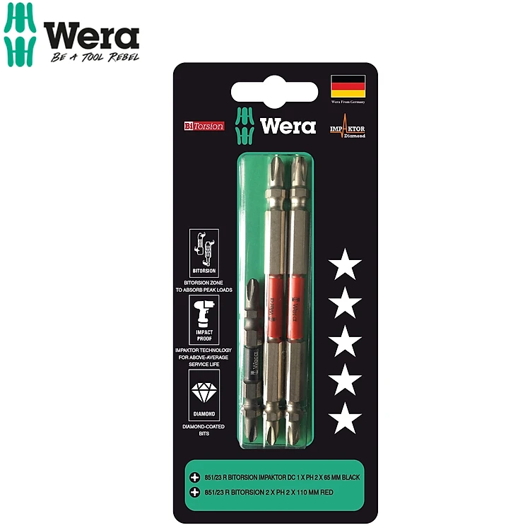 Bộ mũi vít cao cấp 2 đầu 4 cạnh Wera 05344518001 1xPH2x65mm Black và 2xPH2x110mm Red BiTorsion Impaktor DC dùng trực tiếp máy khoan bắt vít