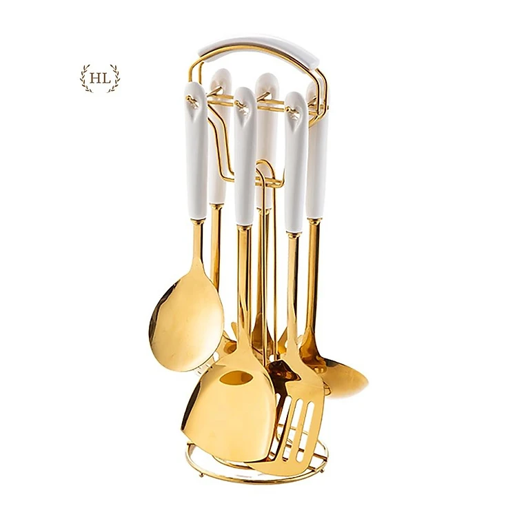 BỘ MUÔI CANH XẺNG INOX VÀNG GƯƠNG CÁN SỨ KÈM GIÁ TREO | BỘ MUÔI VÁ VÀNG GƯƠNG CAO CẤP (LOẠI 1 BẢN SỨ CẦM DÀI)