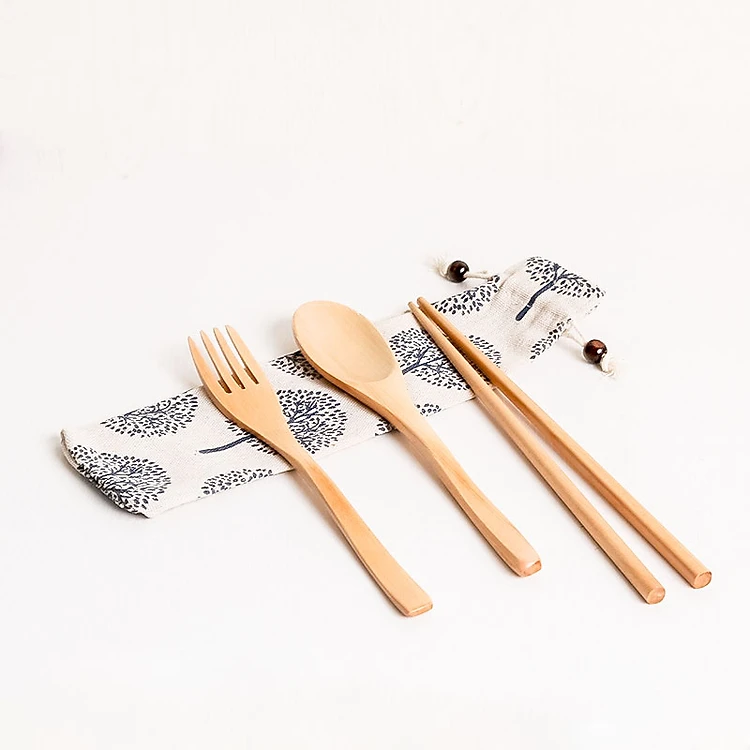 Bộ Muỗng Đũa Nĩa Gỗ Cơm Trưa Kèm Túi Vải Thân Thiện Môi Trường
