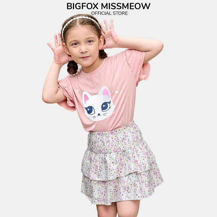 Bộ ngắn tay bèo phối chân váy Bigfox Miss Meow size đại mùa hè vải cotton kiểu Hàn Quốc in mèo dễ thương cỡ 3-11 tuổi 25kg 30kg