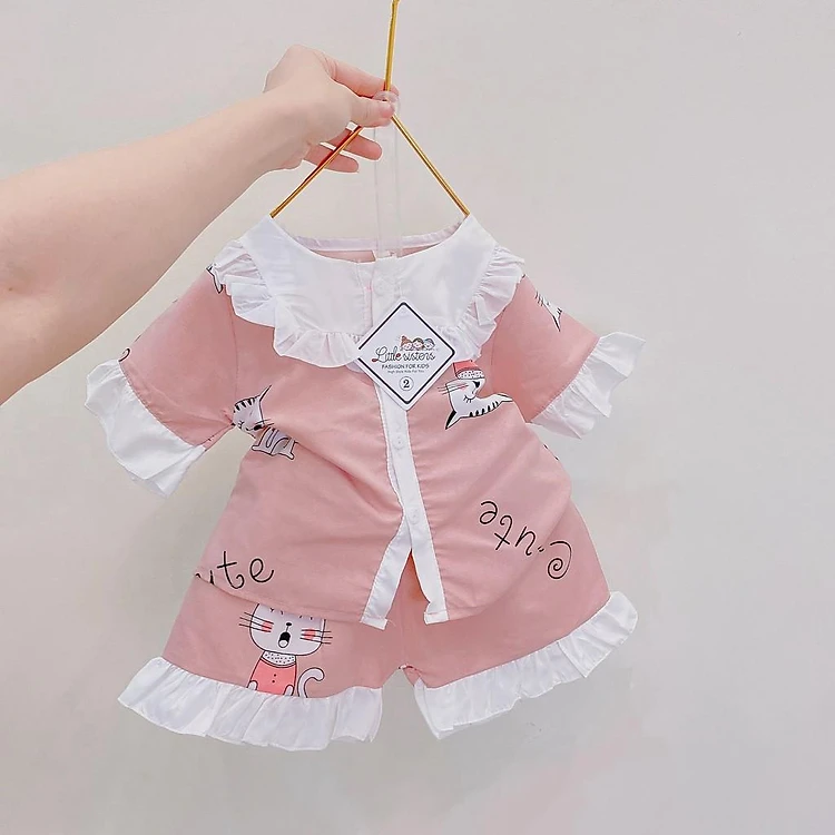 Bộ Ngủ Pịjama Cộc Tay Cổ Bèo Chất Kate Hàn Cho Bé Gái - Babimama