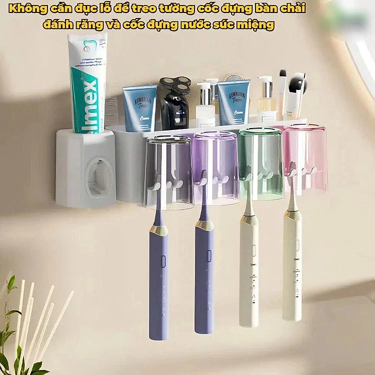 Bộ Nhả Kem Đánh Răng Tự Động Cao Cấp Kèm 4 Cốc – Kệ Để Bàn Chải Gắn Tường