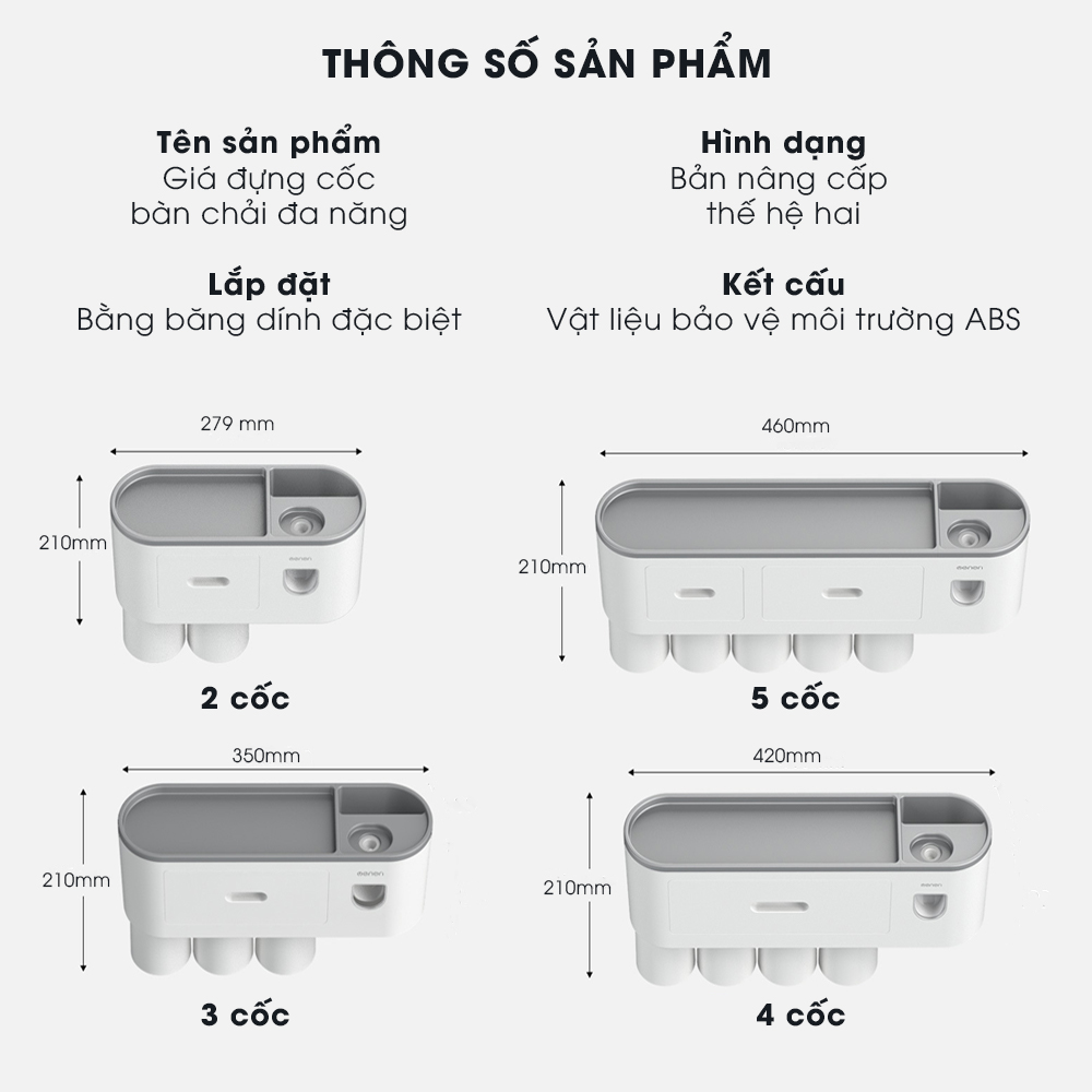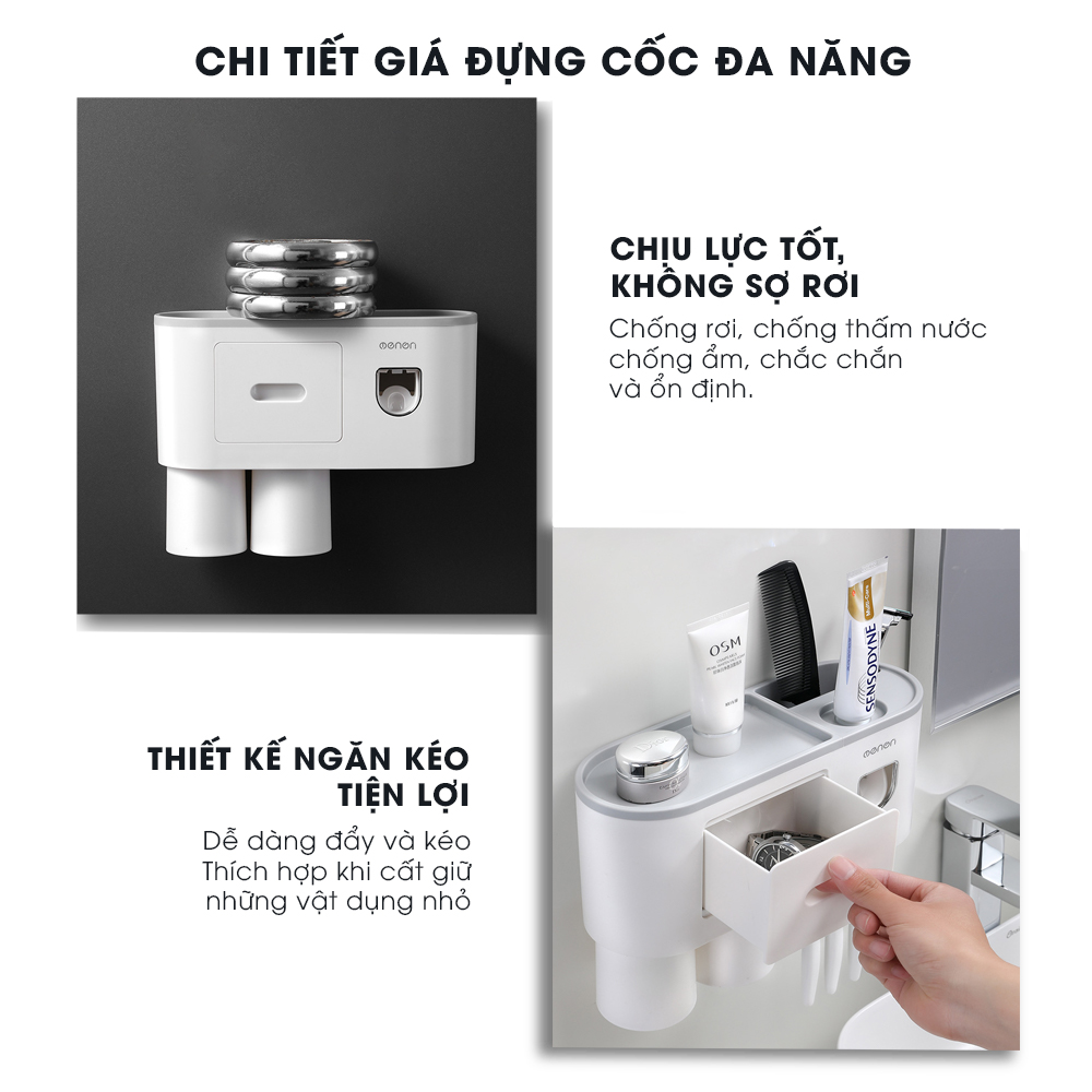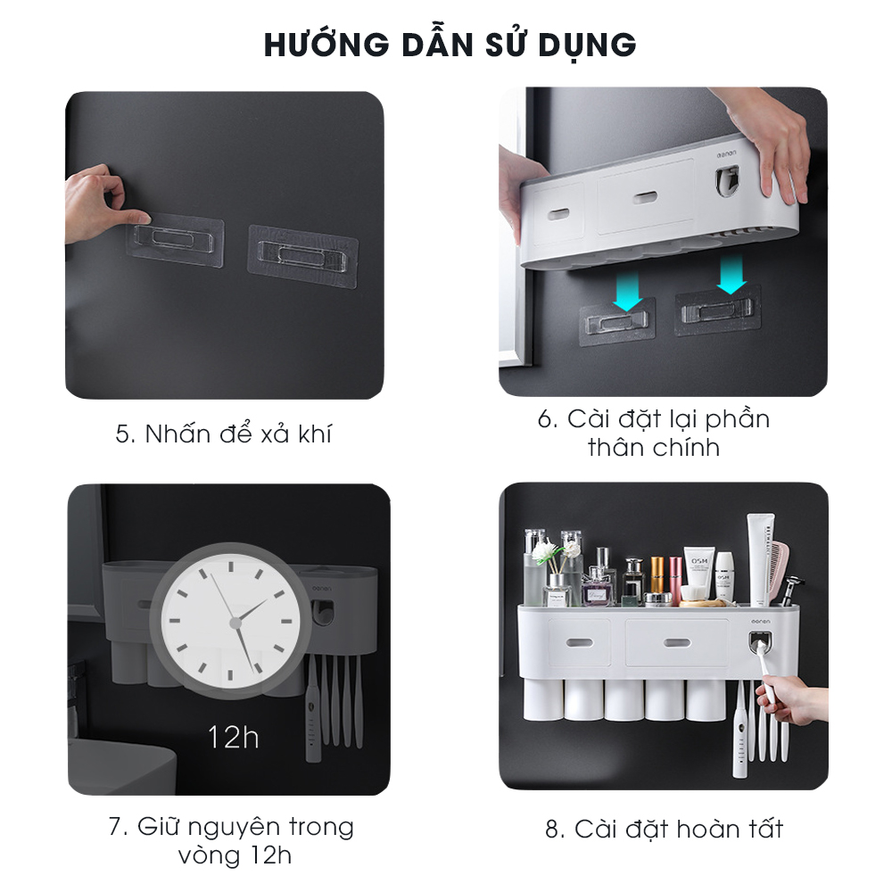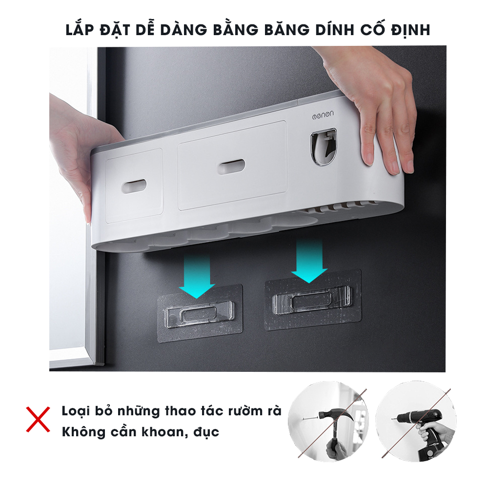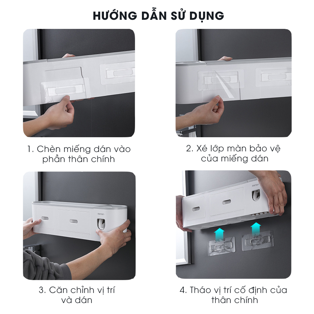 • Sản phẩm bao gồm: 1 kệ tích hợp chức năng lấy kem tự động, cốc hút từ tính và miếng dán tường siêu dính có thể chịu được sức nặng lên đến 6kg.