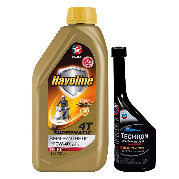 - Bộ Nhớt Xe Tay Ga Caltex Supermatic 10W40 0.8Ll Và Techron Concentrate Plus làm sạch muội than carbon bám vào kim phun, van nạp và buồng đốt động cơ, Muội than sẽ được đốt cháy hoàn toàn trong buồng đốt.