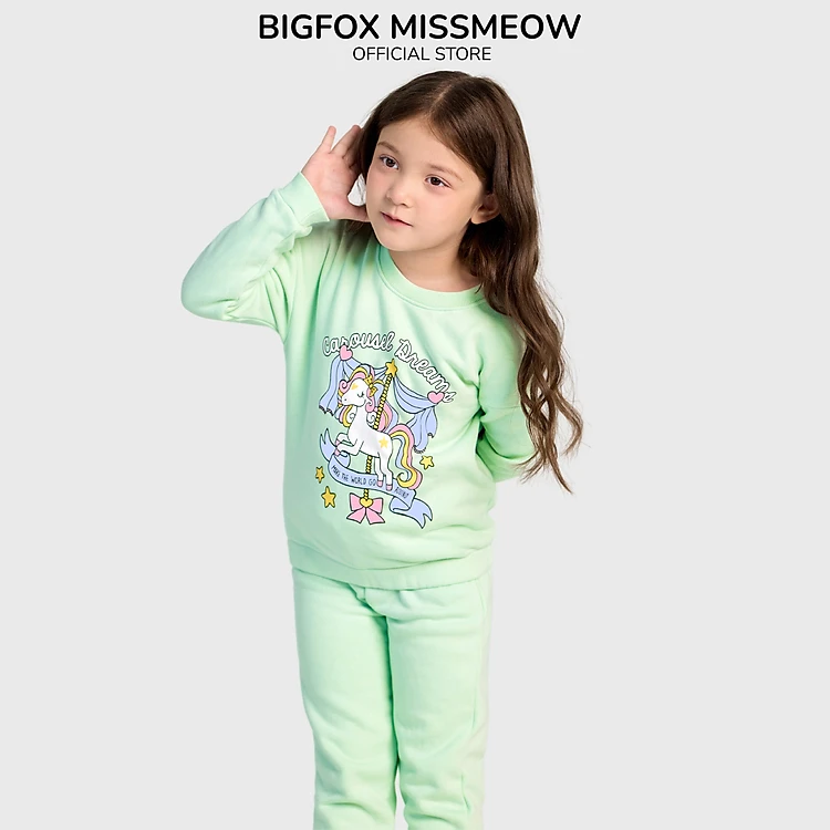 Bộ nỉ bé gái Bigfox Miss Meow, bộ thu đông cho bé vải nỉ bông cao cấp in ngựa đu quay dễ thương size trẻ em 3,4,5…8 tuổi