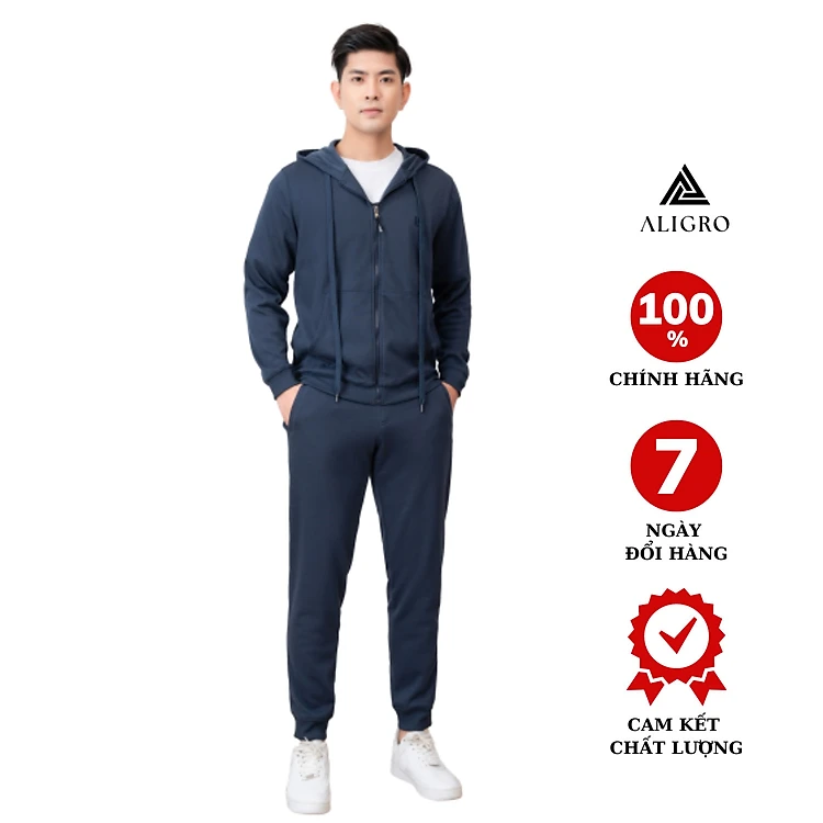 Bộ nỉ hoddie ALIGRO kéo khóa có mũ màu navy BN.15