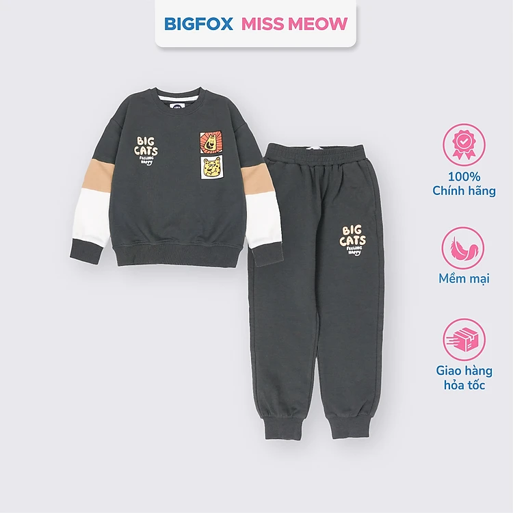 Bộ nỉ thu đông cho bé trai Bigfox Miss Meow size đại dài tay phối màu phom Hàn cỡ trẻ em 3-11 tuổi