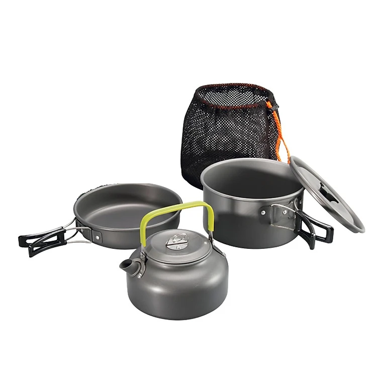 Bộ nồi cắm trại dã ngoại 2-3 người thích hợp cho 2-3 người. Bộ sản phẩm gồm: 1 nồi, 1 chảo rán, 1 ấm đun nước, phụ kiện chén bát và 1 túi đựng sản phẩm. Sản phẩm được làm bằng nhôm nhập khẩu, oxy hóa nhôm cứng cao cấp, chịu nhiệt độ cao và ma sát. Ngoài ra, bộ sản phẩm được đựng trong túi đựng tiện dụng, gọn gàng.
