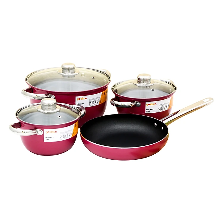 - Bộ 4 nồi chảo Goldsun GE31 - 4307SG có 3 nồi dùng được trên bếp gas, bếp hồng ngoại, bếp từ, riêng chảo không dùng được trên bếp từ.