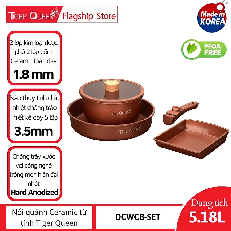 Bộ nồi Ceramic tay cầm rời từ tính Tiger Queen DCWCB-SET [5 món] - Màu nâu chocolate - Chính hãng