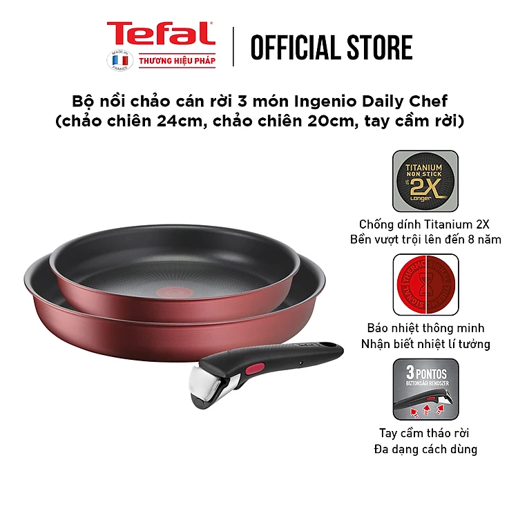 Bộ nồi chảo cán rời 3 món Tefal Ingenio Daily Chef (chảo chiên 22cm, chảo chiên 26cm, tay cầm rời) - Hàng chính hãng