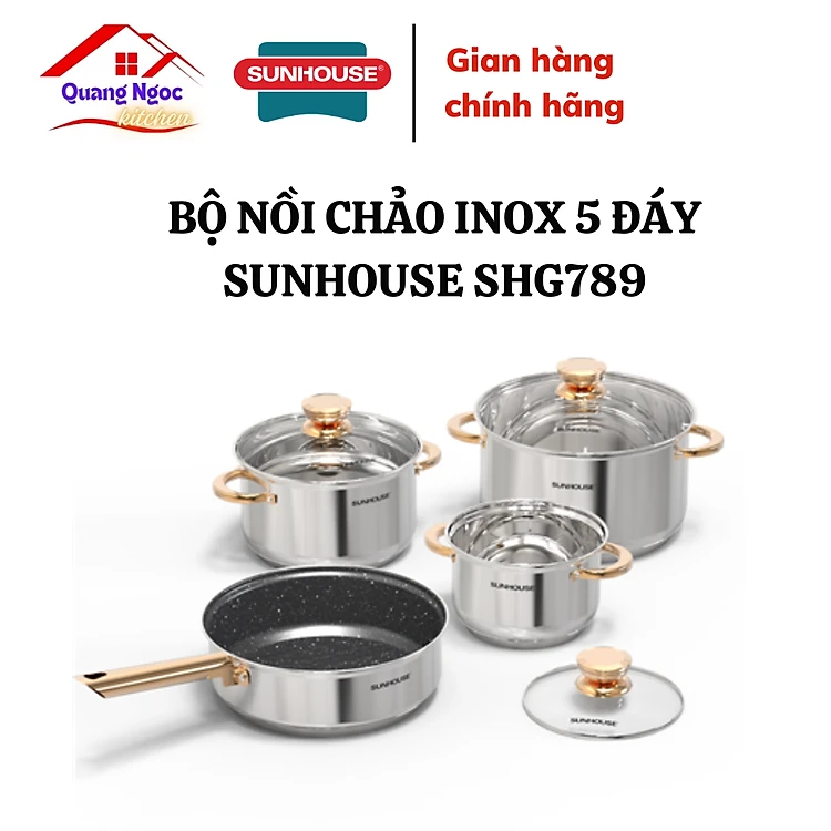 Bộ nồi chảo inox 5 đáy Sunhouse SHG789 - quai chống nóng mạ vàng - Hàng chính hãng