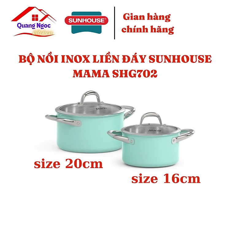 Bộ nồi inox 304 đa lớp liền đáy cao cấp Sunhouse mama SHG702, size 16 20cm, sơn xanh lớp ngoài