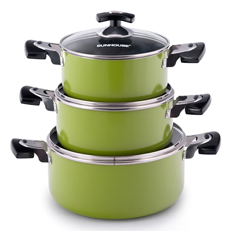 - Bộ Nồi Nhôm Đáy Từ Sunhouse SH505M - Xanh Cốm có chất liệu hợp kim nhôm cao cấp giúp giữ nhiệt lâu và truyền nhiệt đều, tiết kiệm nhiên liệu để làm nóng nồi. Đặc biệt đáy nồi bằng hợp kim nhôm dày 2.0 đến 2.2 mm giúp cho ngọn lửa không tiếp xúc trực tiếp với thực phẩm, giúp giữ nguyên hương vị và chống cháy khét khi xào, nấu.