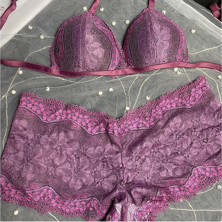 Bộ Nội Y Thiết Kế Ren Cao Cấp Hồng Tím Có Mút Quần Đùi
