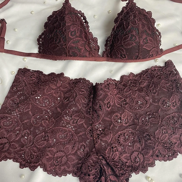 Bộ Nội Y Thiết Kế Ren Cao Cấp Tím Mận Có Mút Quần Đùi