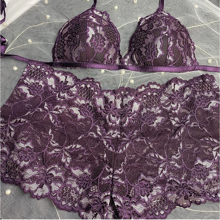 Bộ Nội Y Thiết Kế Ren Cao Cấp Tím Than Có Mút Quần Đùi