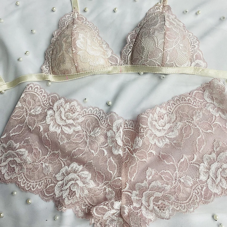 Bộ Nội Y Thiết Kế Ren Cao Cấp Trắng Hồng nhạt Có Mút Quần Đùi
