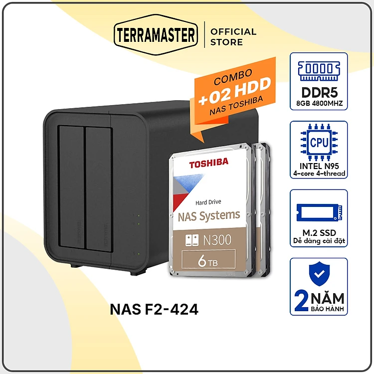 Combo Thiết bị lưu trữ NASTerraMaster F2-424 kèm 1 ổ cứng Toshiba NAS N300 24/7 Hàng chính hãng