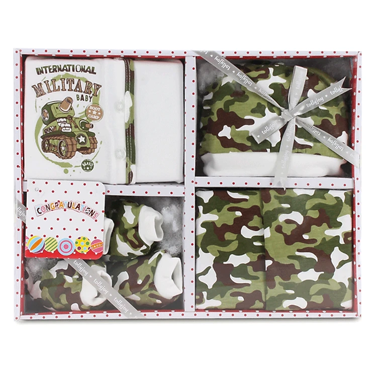Sản phẩm có họa tiết quân đội, áo in hình xe tăng đẹp mắt mang lại cho bé trai nét đáng yêu, ngộ nghĩnh. Bộ sản phẩm gồm 1 bộ quần áo, 1 nón, 1 set vớ tay vớ chân sẽ là quà tặng đáng yêu và ý nghĩa cho bé trong những năm tháng đầu đời.
