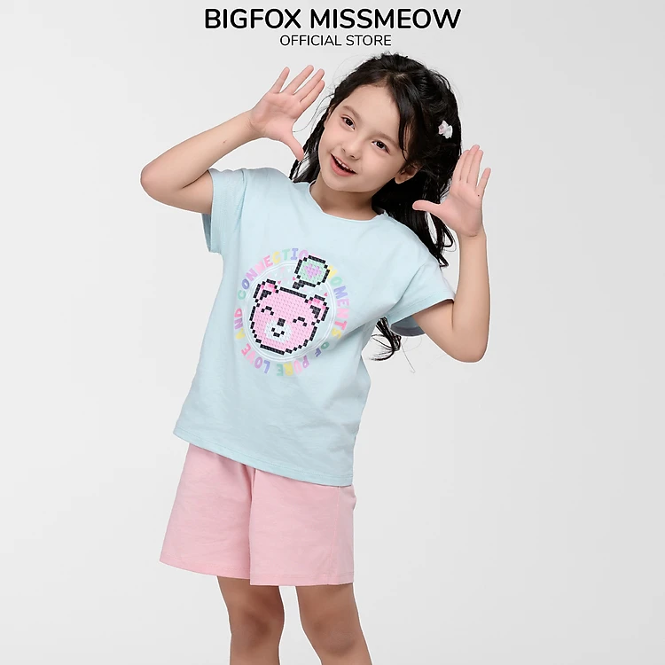 Bộ quần áo bé gái Bigfox Miss Meow mùa hè size đại vải cotton in gấu cỡ 3,6,9,11 tuổi 30kg 40kg