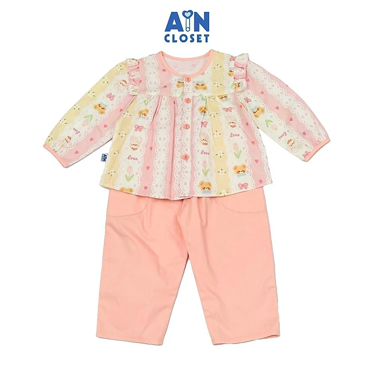 Bộ quần áo Dài bé gái họa tiết Gấu Thỏ Hồng Cotton - AICDBGPPHXWM - AIN Closet