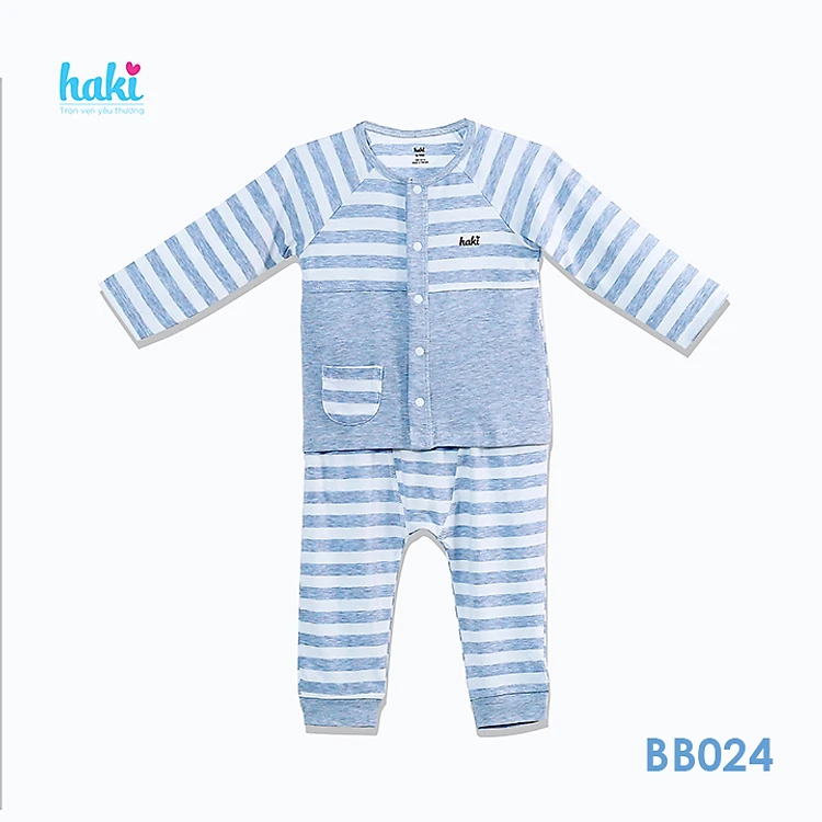 Bộ quần áo sơ sinh cho bé vải sợi tre - bamboo siêu mềm mịn cao cấp - đồ sơ sinh cho bé bé trai , đồ sơ sinh bé gái (2,5kg - 12kg) - bộ dài tay kẻ cài giữa cho bé Haki BB024