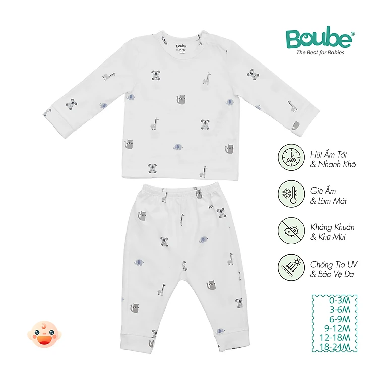 Bộ quần áo dài tay cúc bấm vai họa tiết xinh xắn cho bé Boube, Vải Cotton organic thoáng mát - Size 0-24M