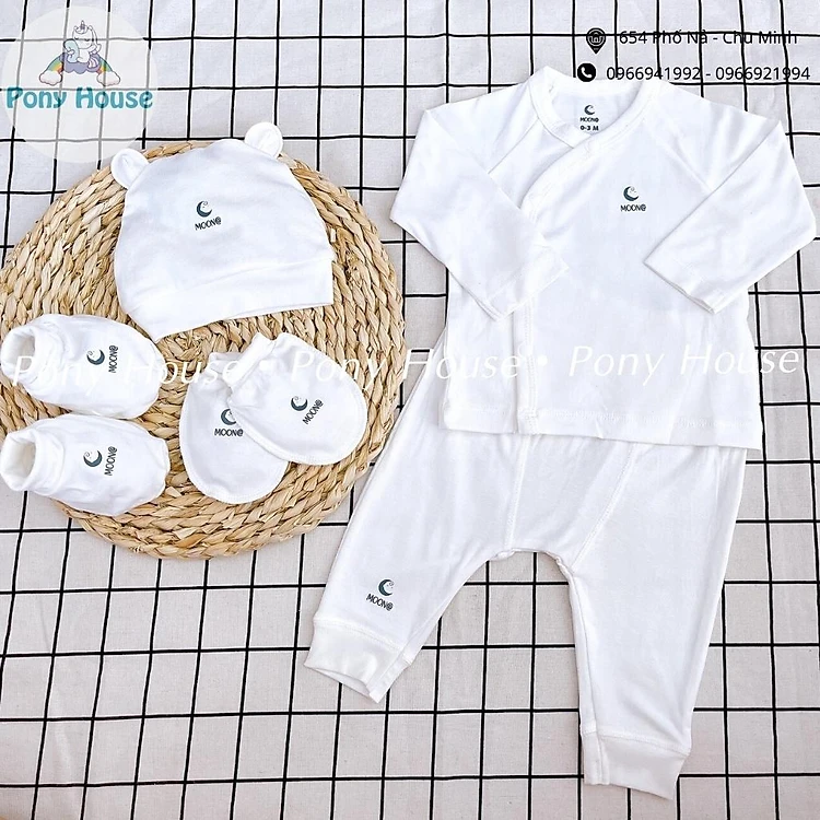 Bộ Quần Áo Dài Tay Moon Cài Lệch Trắng Chất Petit Cho Bé Sơ Sinh Bé Trai, Bé Gái (0-3 Tháng / 3-6 Tháng)
