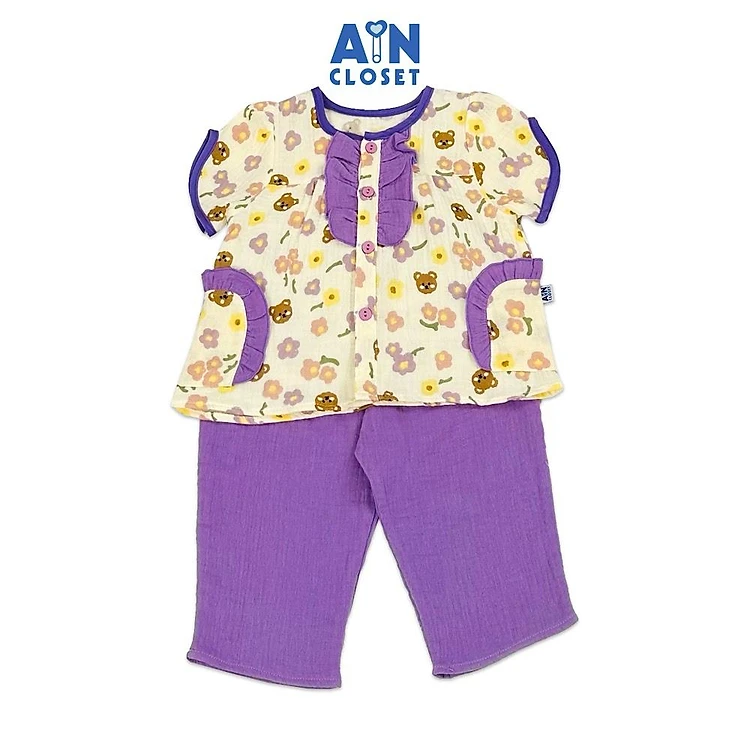 Bộ quần áo Dài tay ngắn bé gái họa tiết Hoa Gấu Tím xô muslin - AICDBGHDVWBG - AIN Closet