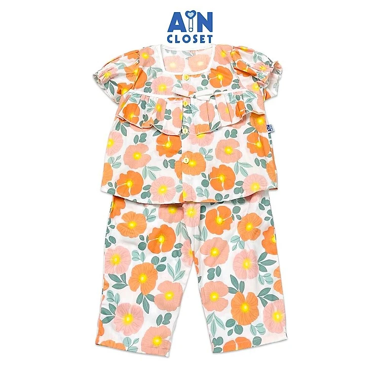Bộ quần áo dài tay ngắn bé gái họa tiết Hoa Muống Biển cam cotton - AICDBGDAW2RF - AIN Closet