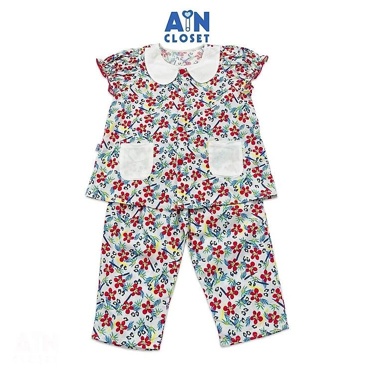 Bộ quần áo dài tay ngắn bé gái họa tiết hoa Sử Quân Tử đỏ cotton - AICDBGJUSLAT - AIN Closet