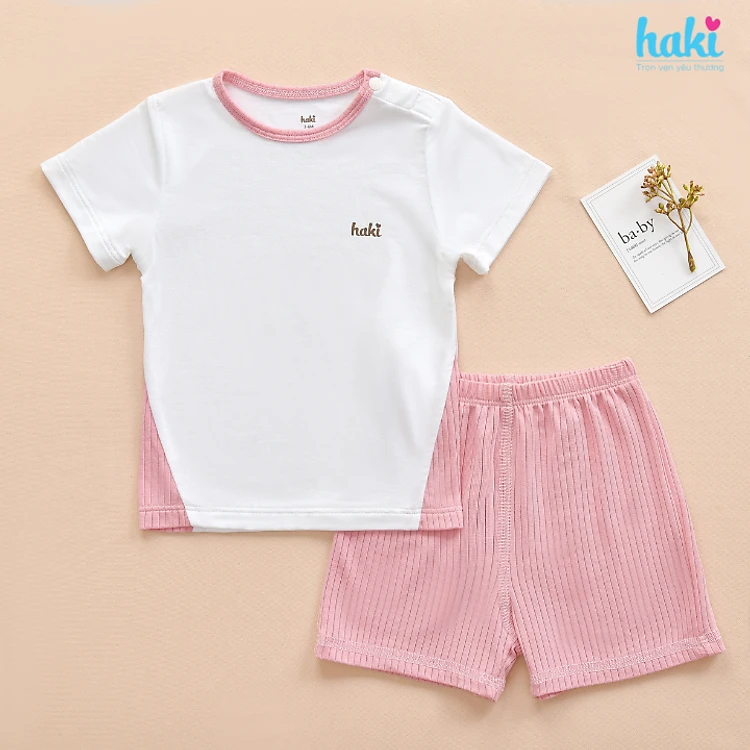 Bộ quần áo mùa hè cộc tay cài vai phối sườn vải Modal cao cấp siêu mềm mịn cho bé, set sơ sinh cho bé từ 3 tháng - 3 tuổi chất liệu gỗ sồi xuất khẩu HAKI BM014 (4-15kg), quần áo hè cho bé trai bé gái