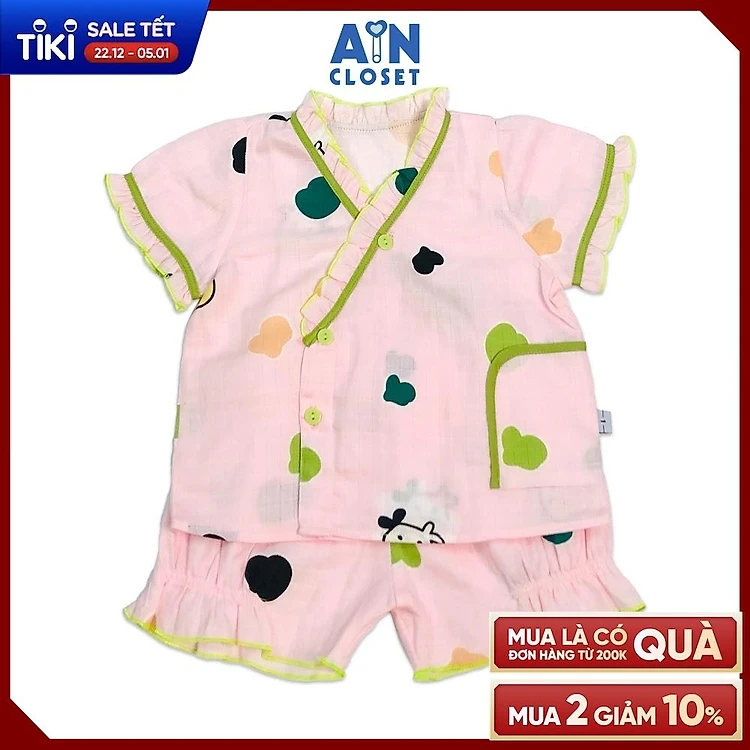 Bộ quần áo ngắn bé gái họa tiết Bò sữa nền hồng xô sợi tre - AICDBG2URGT0 - AIN Closet