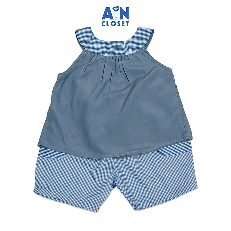 Bộ quần áo Ngắn bé gái họa tiết Caro Nhí Xanh Xám cổ yếm cotton. - AICDBTWQMCKG - AIN Closet