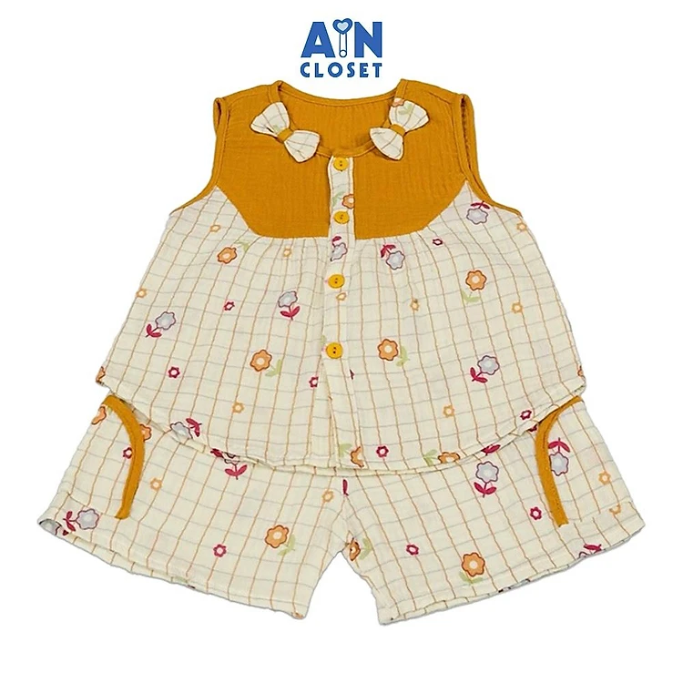 Bộ quần áo Ngắn bé gái họa tiết Caro Nơ Vàng Xô muslin - AICDBG8JVJTE - AIN Closet