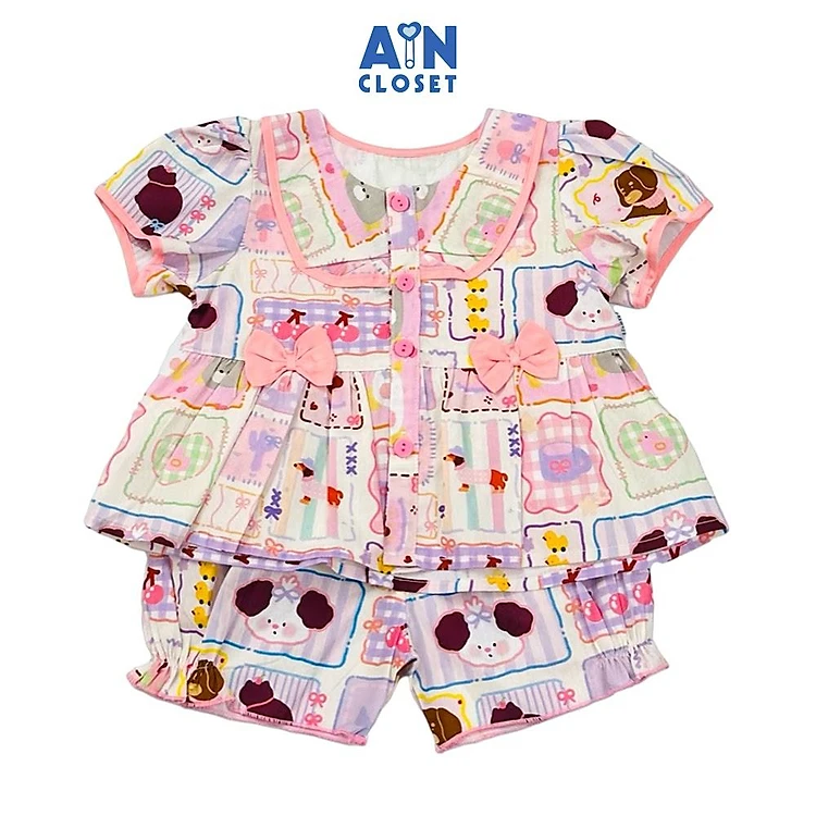 Bộ quần áo Ngắn bé gái họa tiết Cún Nơ Hồng Cotton - AICDBG9H6T3C - AIN Closet